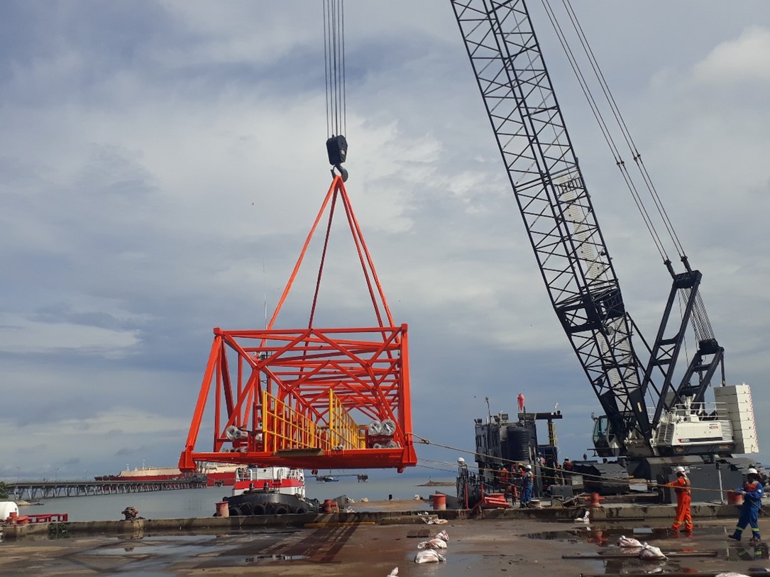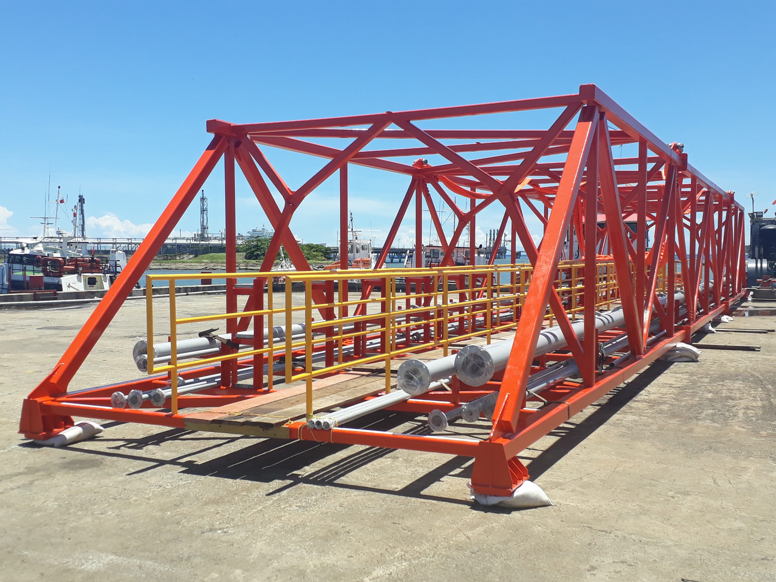 A new bridge being installed between the two offshore platforms.  The bridge measures 10ft x 15ft x 100ft outfitted with 18 pipelines ranging in size from 2” diameter to 8” diameter with a combined weight of approximately 35T as shown below.